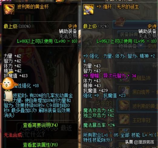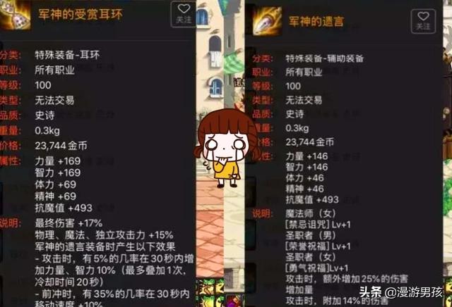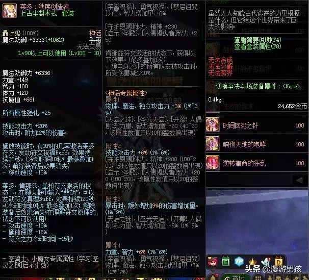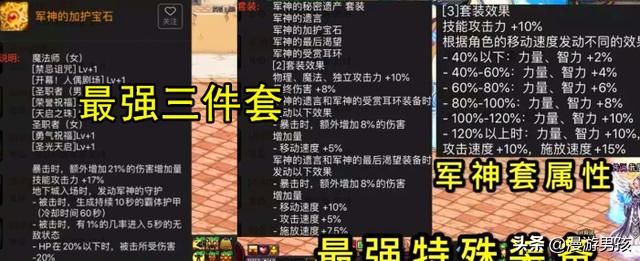 值得一说的是之所以这套最强,是因为100版本中神话装备的耳环搭配其他两件属性最大化,这套装备拥有百分之30以上的三攻和所攻,额外暴击伤害高达百分之25,大量技能攻击力和额外黄字伤害还有力量智力百分比以及白字伤害,再加上超高的三速,被公认为100版本的三神器。