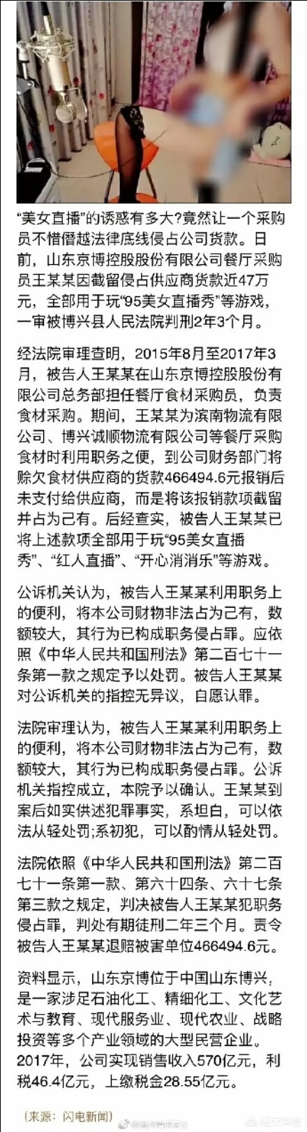怎么看待山东一企业餐厅采购员职务侵占货款47万,全花在“美女直播”游戏上这件事
