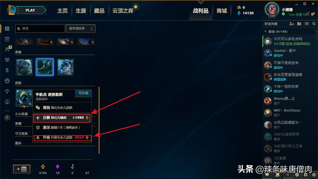 橙色精粹的用处也是一样的,开出皮肤碎片以后就可以牺牲一定数量的橙色精粹合成皮肤了,限定、史诗的都有,所以用处是非常非常大的。