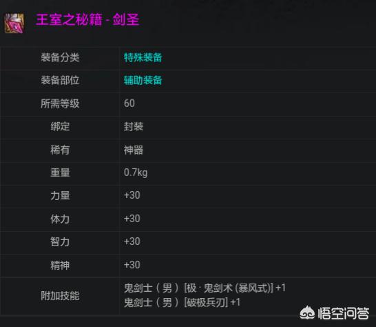地下城王室之秘籍剑圣是剑魂破极兵刃的换装左槽,王室秘籍自带一级破极兵刃,剑魂是四鬼剑之一,玩家很多,剑魂是物理百分比职业,土豪玩家也多,所有王室秘籍剑圣物价很高。