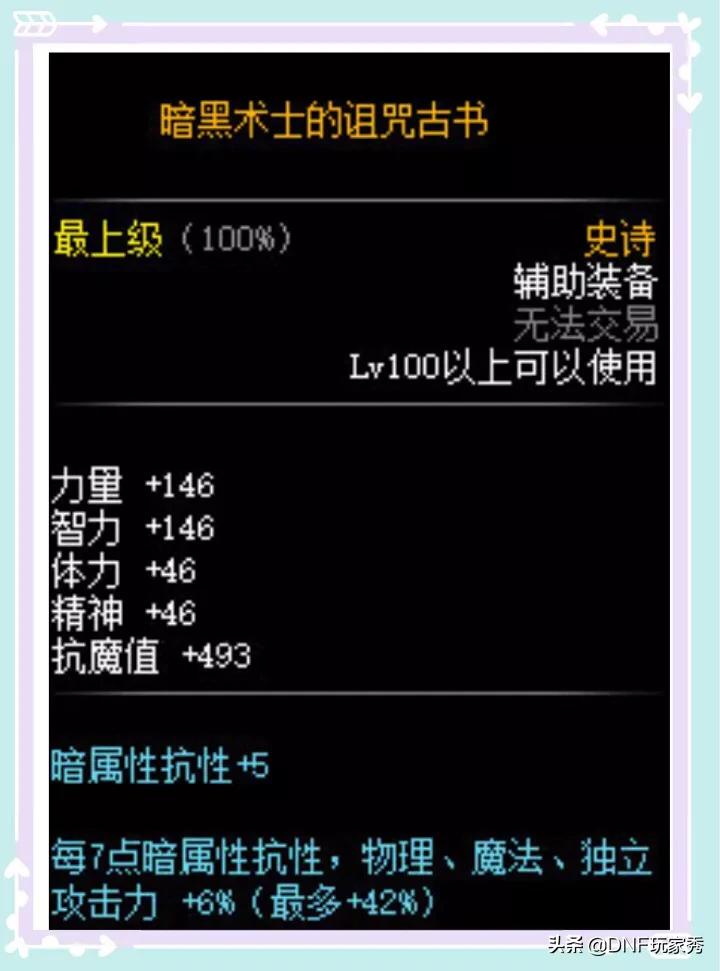(3)辅助装备部位,暗抗+5,每7点暗抗增加6%三攻,最高42%,需要49点暗抗。