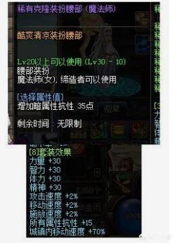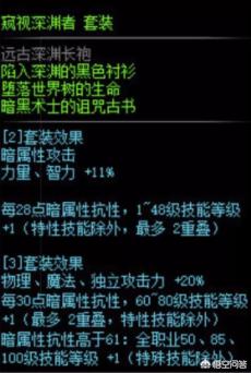 (4)套装属性,2件套,力量智力11%,28点暗抗,1-48技能等级+1,最多加2;三件套,三攻20%,60点暗抗,60-80技能+2;暗抗高于61点,一觉,二觉,三觉技能+1!