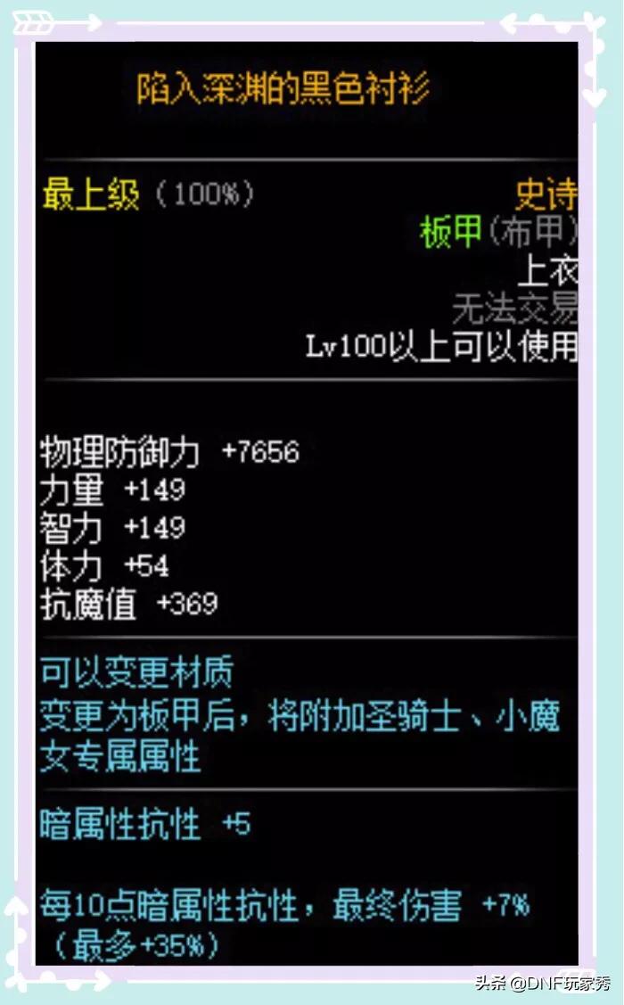 (1)上衣部位,暗抗+5,10暗抗+7%最终伤害,最高35%的最终伤害增加,需要堆50暗抗;