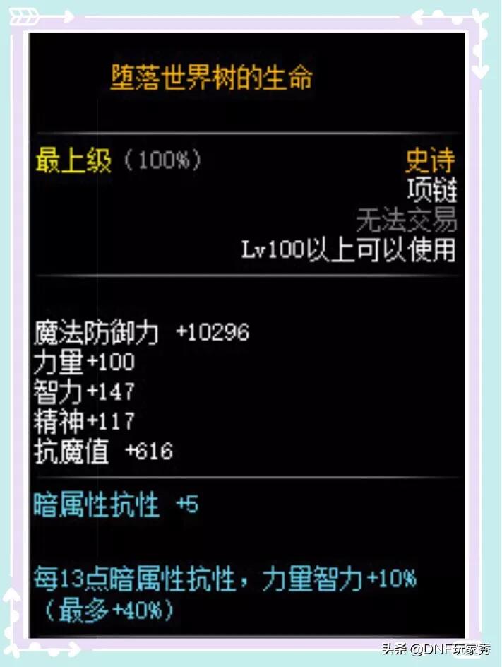 (2)项链部位,暗抗+5,13点暗抗增加10%力量智力,最高40%,需要堆52点暗抗。