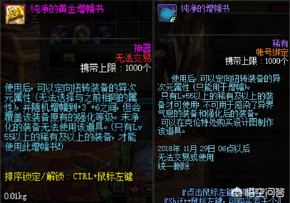 而在DNF这么多道具中,只有增幅书可以做到强打红字,而增幅书有2中,一种叫做纯净的增幅书,一种是纯净的黄金增幅书,这两种是有区别的。
