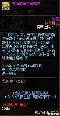 黄金增幅书同样是可以在已经净化气息的装备上使用,自选一个异次元力量并且还能随机赋予+3到+6的增幅数值,对于没有异界气息的装备,无论是否已经强化都能使用,但是使用后也是随机赋予3到6的增幅数值。