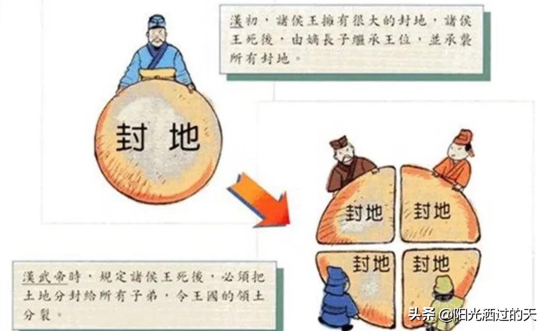即汉武帝为加强中央集权,于公元前127年采纳大臣主父偃的建议,颁布“推恩令”,准许诸侯王把自己的封地再分给子弟,建立侯国。一个王国分出许多小侯国,直属领地小了,就无力再与中央对抗了。