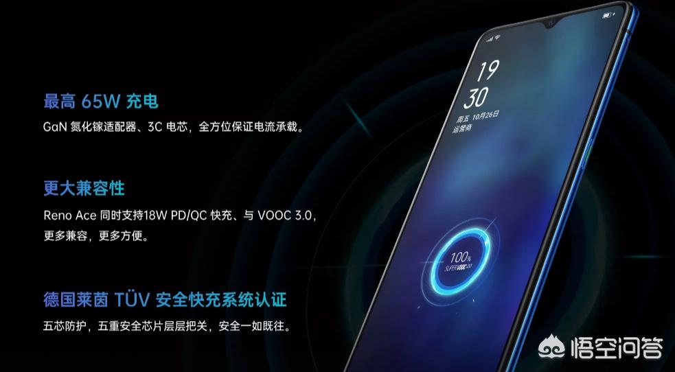 OPPO Reno Ace最大的特色就是65W的快充,27分钟就可以充满电量,5分钟可以充27%的电量。而且它的充电器是氮化镓技术的,体积很小,便于携带。它的摄像头是索尼IMX 586,并支持5倍的混合变焦。副摄除了长焦和广角镜头之外,还有一枚单独的黑白镜头。同时OPPO Reno Ace也是三款手机中唯一保留耳机孔的。