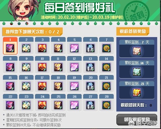 此次签到活动从2.20日开启到3.19日结束总共持续28天的时间,通关两次推荐地下城之后可以获得签到奖励,奖励从左往右数分别有精神刺激灵药礼盒(3个),王者契约1天,超·星空裂缝套装礼盒(2张票1个白斯水),斗神之吼礼盒(3个),10个雷米,20个宠物饲料,1个复活币,奖励以此类推,就每日的奖励来说一般般。