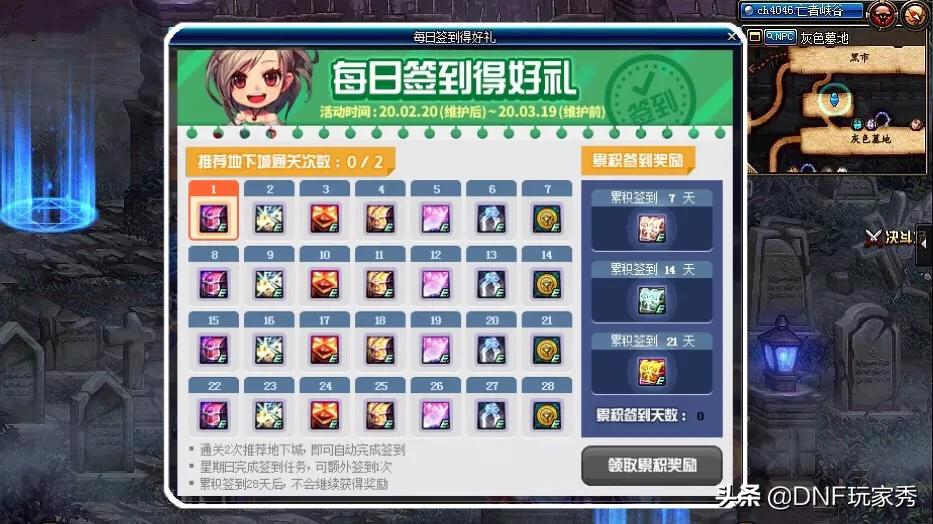 DNF体验服再次更新,重磅推出每日签到活动,时间线是2月20日到3月19日,勇士们期待的100级版本,正式定档于3月19日发布。此次的每日签到,和以往的签到活动一样,每天刷2次推荐图即可完成签到,周日还可以额外签到一次,一共32次签到机会,完成累计任务21天,应该是没有什么问题的。
