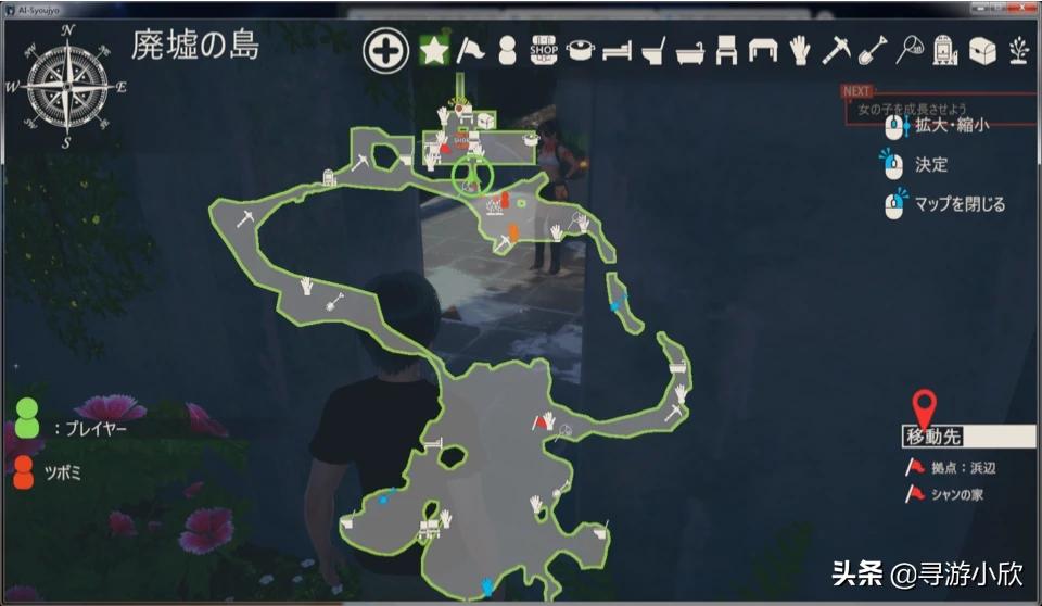 Ps:地图上有用的点,最左下角厕所位置附近不定期会出现特殊宝箱,可以不定期去看下,最右侧手套收集点可以获得溪水,路过的时候顺便收集下比较好,后面做料理用得上,左上角的机器处可以更换男女角色和外表,如果出现妹子过劳,可以用机器直接切换其他妹子再切回来,过劳会消失但是大多时候饥饿都会是0,妹子生病的时候点给药,然后进来之后上面到时候会有两个分类栏,一定要点图片上胶囊的分类,要不然看不到药。