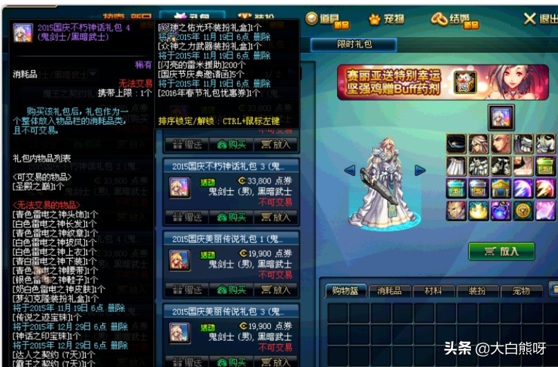 2.每当过节dnf都会出节日礼包,非常实惠。礼包里的装扮也能当作梦想合成器合成天空的材料。用礼包套来合成天空,不仅有一套天空,武器装扮,光环,宝珠等都有。