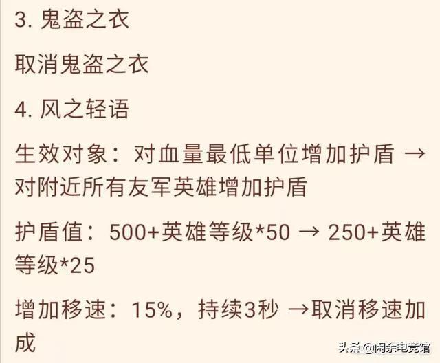 第四件被调整了装备也是一件辅助装备,详细情况可以看上图,所增加的护盾和之前也是不一样,并不是给血量最低的加,唯一比较可惜的就是取消了移速加成!