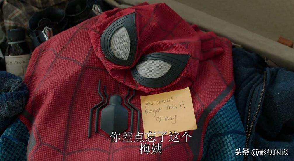 或许起初梅姨并不知道帕克是如何获得超能力的,但随着新闻报道、学校反馈等一系列蛛丝马迹的出现,梅姨早已猜到了八九。梅姨是一位聪明、成熟的女性,对待敏感、叛逆但并不成熟的小蜘蛛彼得·帕克,她始终是“睁一只眼闭一只眼”,像很多西方的父母一样,通过默默关注和支持的方式,间接帮助小蜘蛛的成长和成熟。