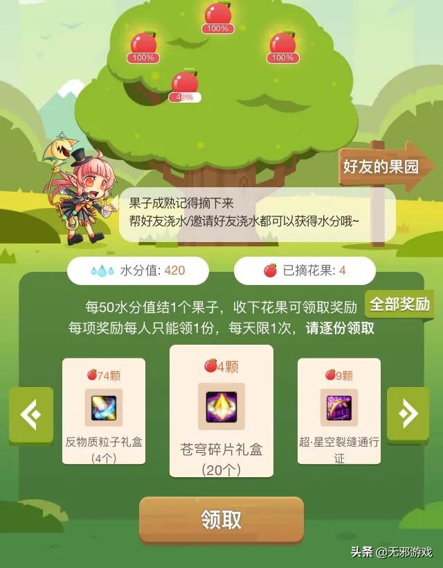 不过,没有好友也无所谓,水分是每小时+10,每天就有240水分,50分成熟一个果子,每天就有4.8个果实,有朋友更快,好友帮忙获取200水分,帮好友获取60水分,每天最多共获取500水分,10个果实!不过熟了一定要摘,不然被偷了就舒服了!