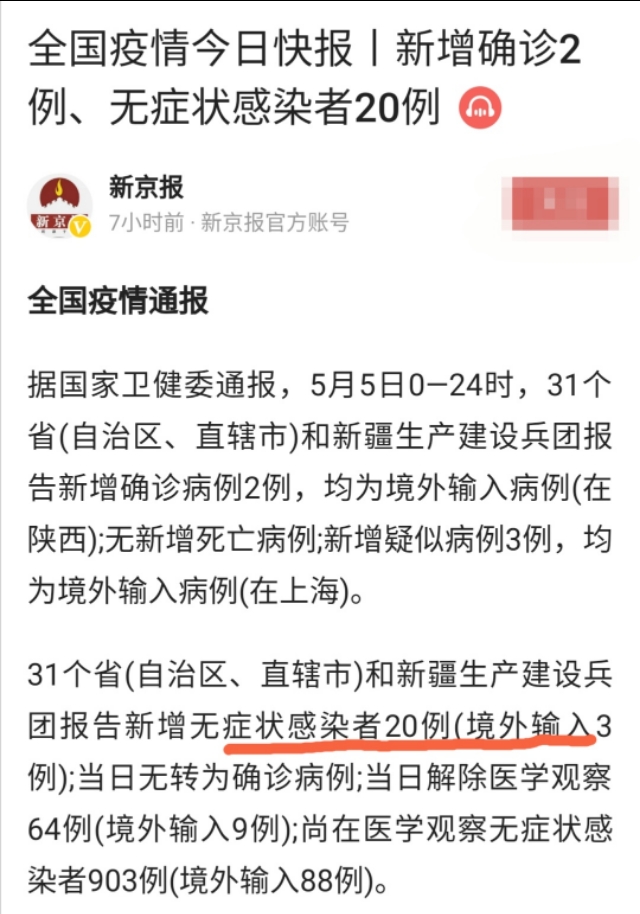 据新京报报道,全国在5月5日31个省市出现新增确诊两例,来自于陕西,属于境外输入。新增三例疑似病例,来自于上海,也是属于境外输入病例。