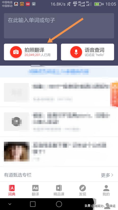 1、首先,我们需要一个有道词典,在手机上打开,如图所示。