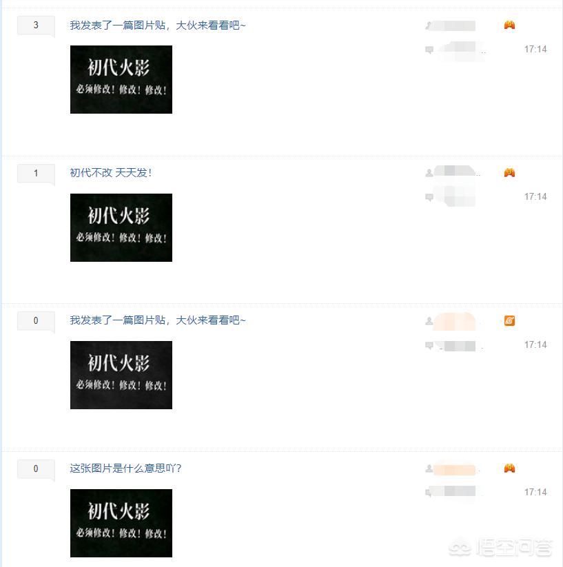 在刚刚公布了本周的更新公告后,玩家们没看到初代优化信息,所以自行跟风发起了刷屏行动,其实这个也在意料之中,毕竟作为忍者之神的初代,做成这个样子确实不会让大多数人满意(有小部分人其实觉得无所谓),终于,积攒了一周的怒火在这一刻爆发,吧主们应该都在忙着删帖子了。