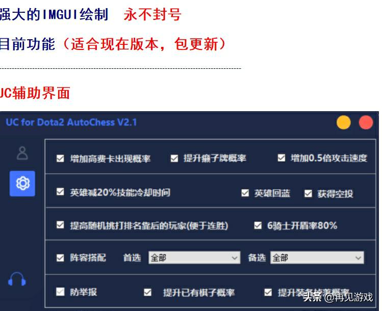 从这个外挂上我们可以看到,里面不仅有提高卡片的概率,增加攻速,减少冷却,回蓝,就连阵容搭配他都给你已经选好了。而且目前云顶之弈中并没有反外挂系统,可以说如果选择这样的外挂的话,玩家能够轻松的吃鸡。