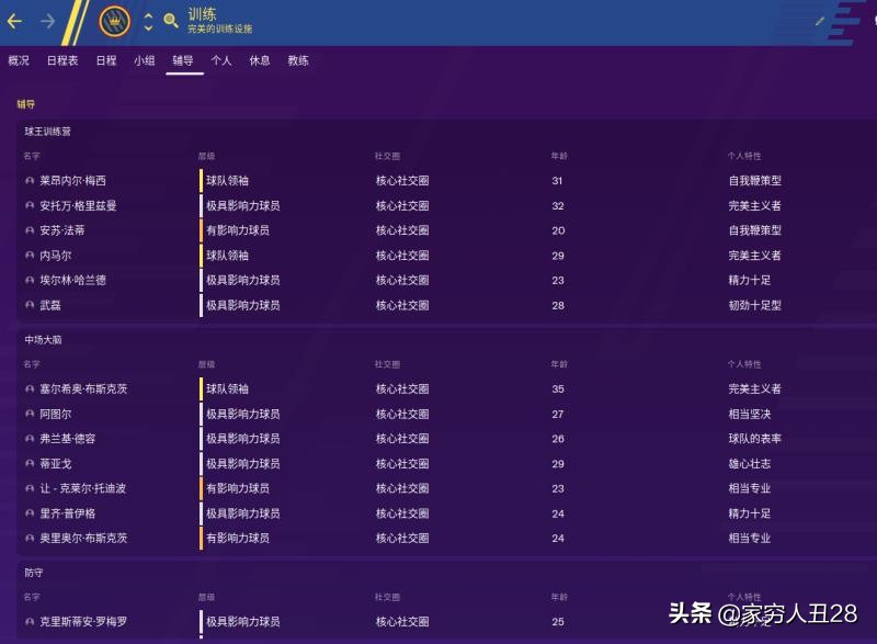 第二,老带小进步,用球队中年龄较大经验丰富的球员与小牛共同训练,在fm2019及以前叫作拜师,在fm2020中叫做辅导,将球员放入一个辅导小组,小牛会学习提升。