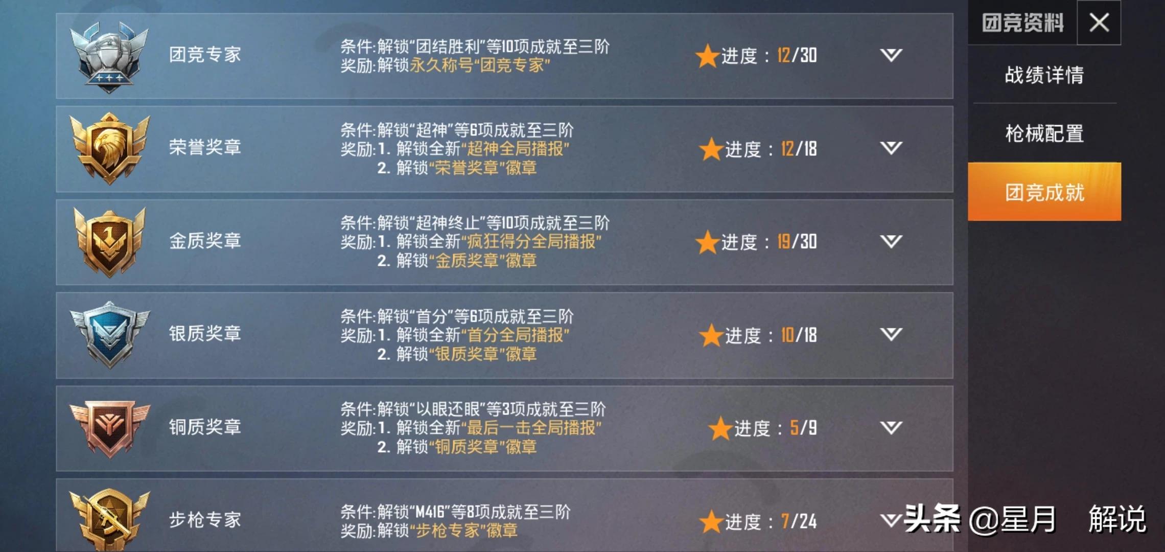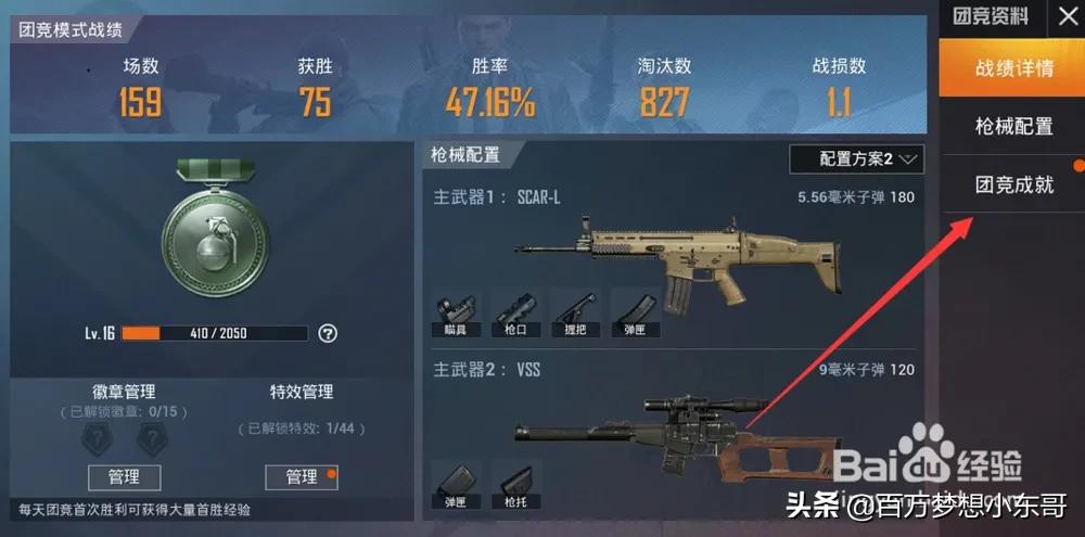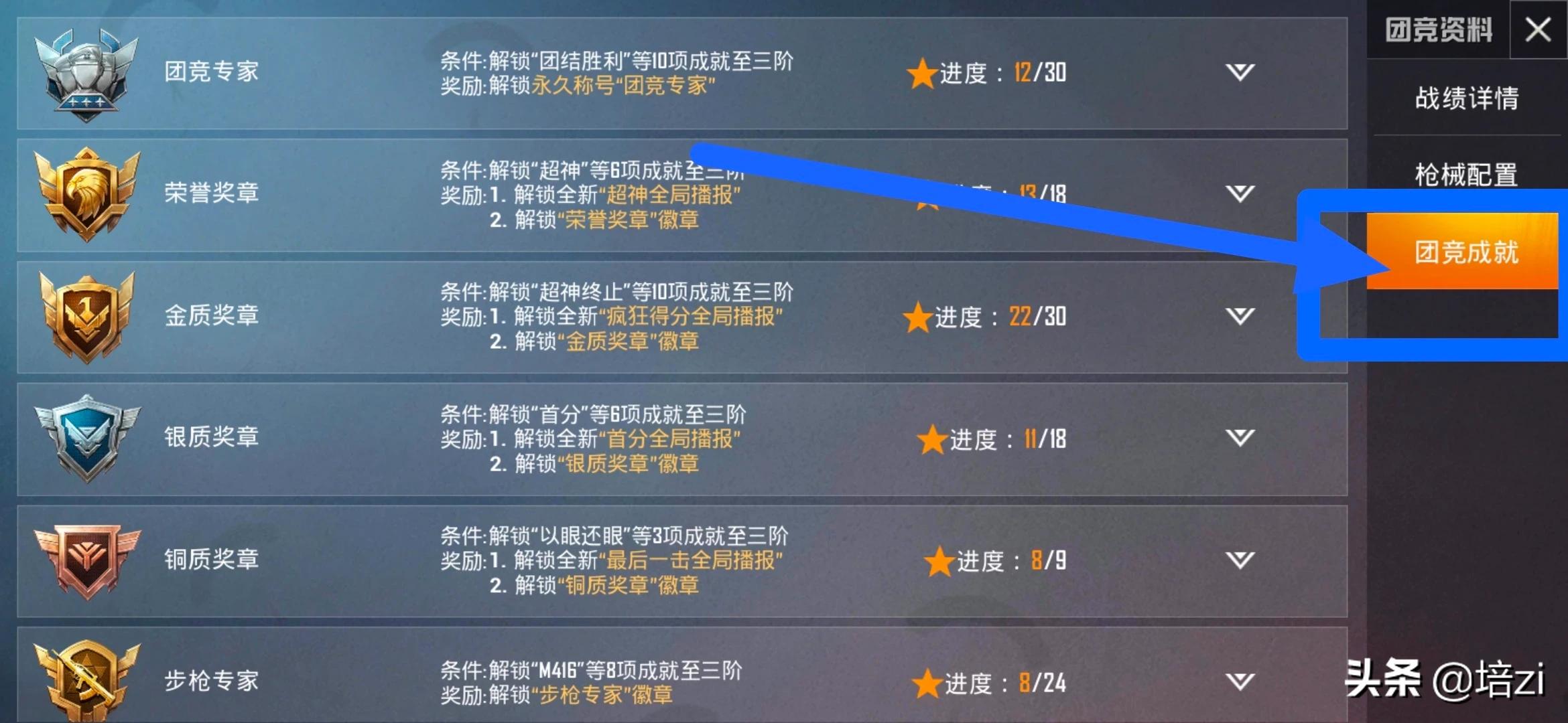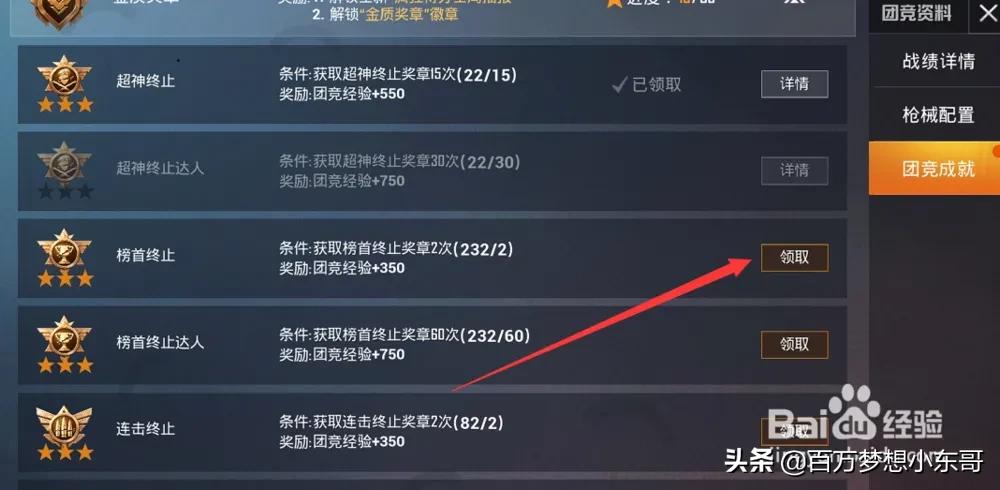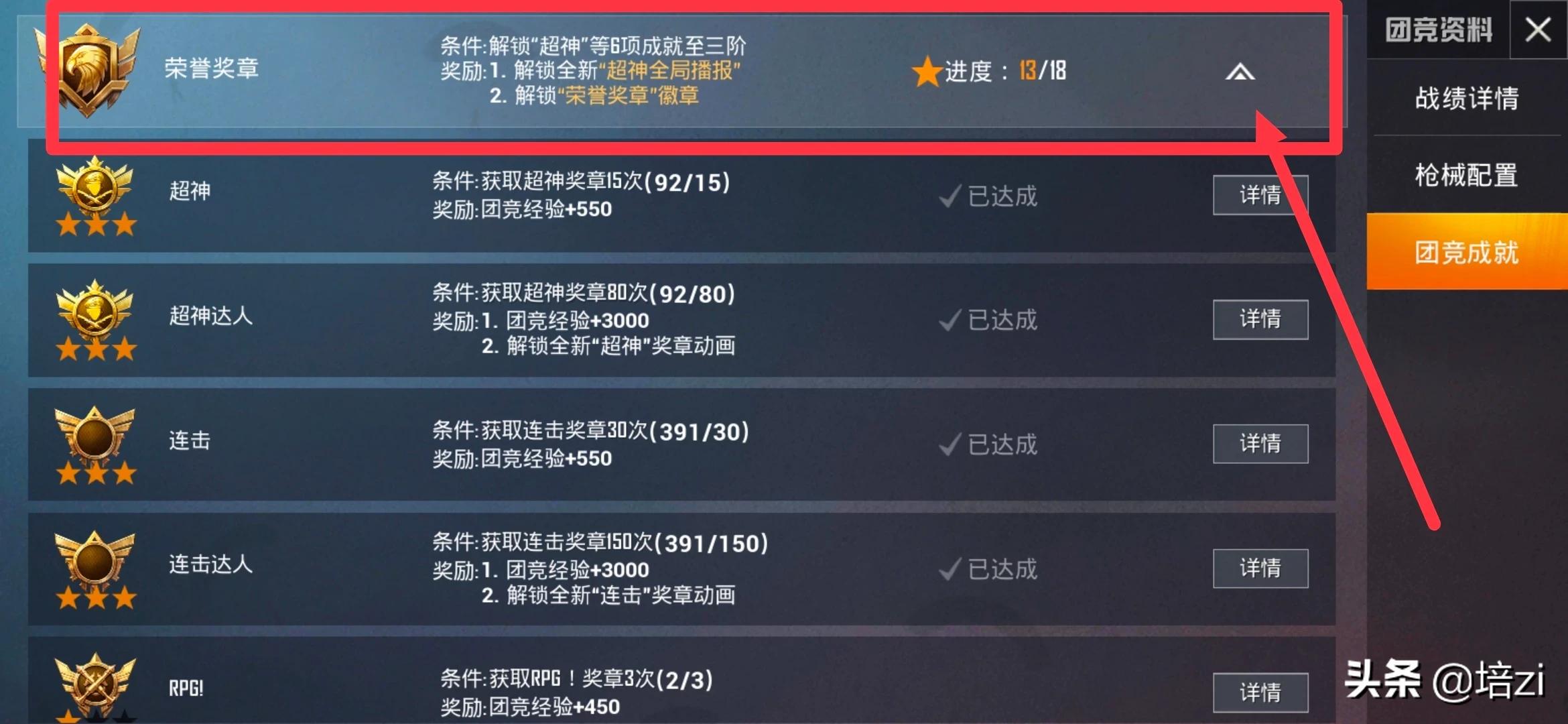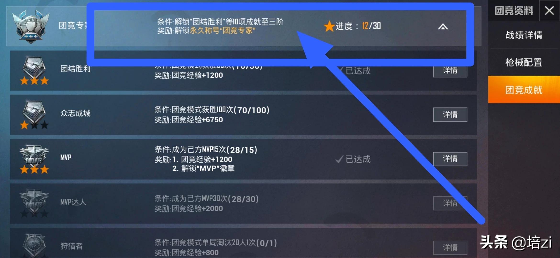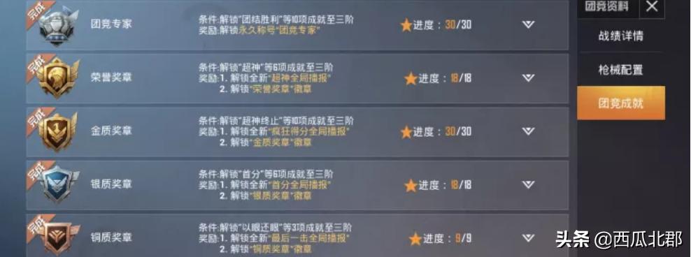 另外,关于如何“上分”:在右侧【团竞成就】里打开,白色上三角可以查询你已经完成的,在游戏前可以有选择地完成所有项目,那分自然就上去了,团竞等级也会跟着往上。