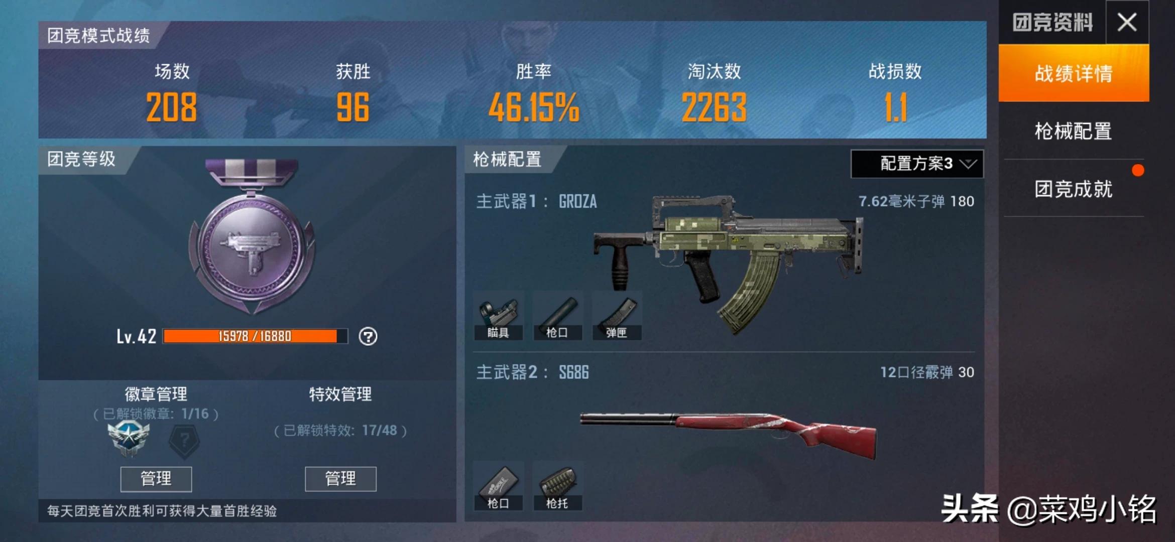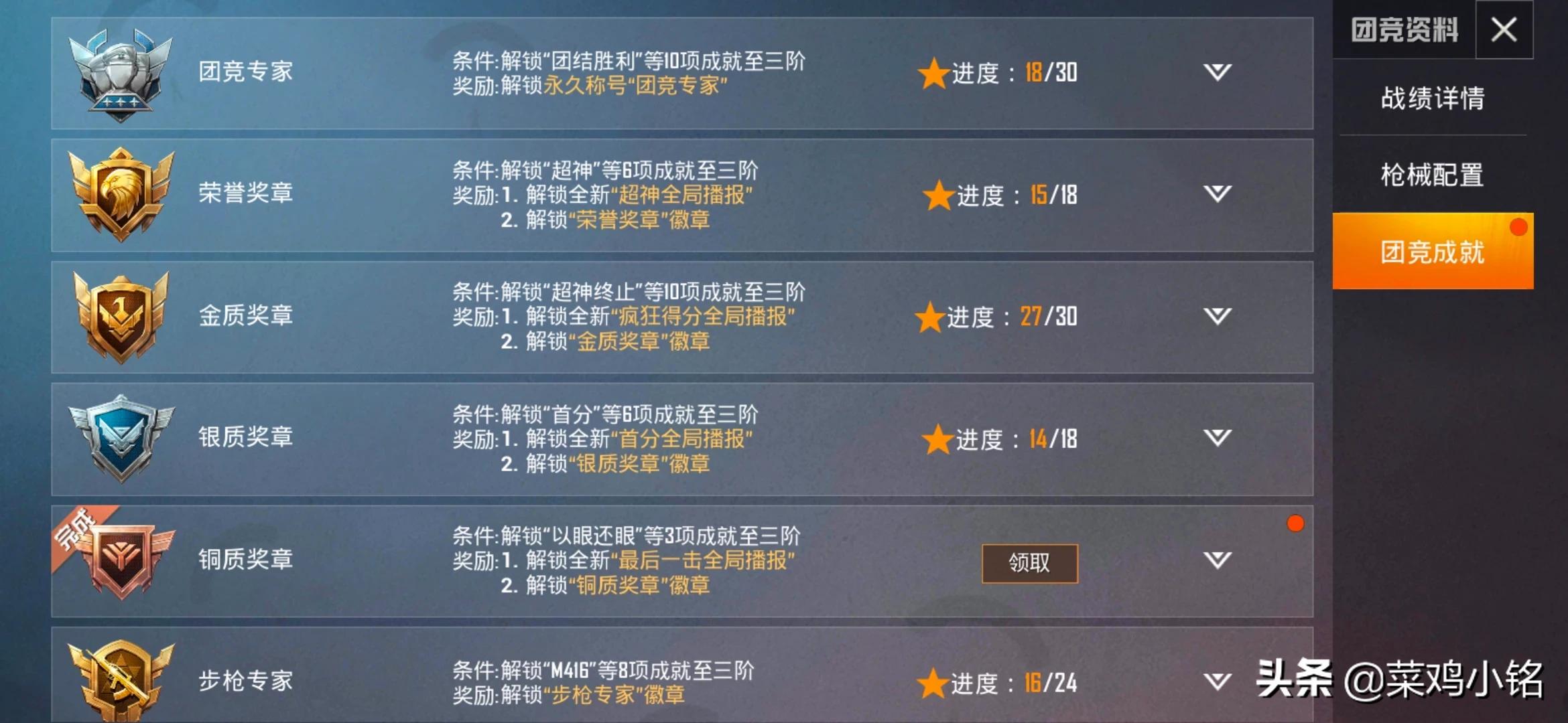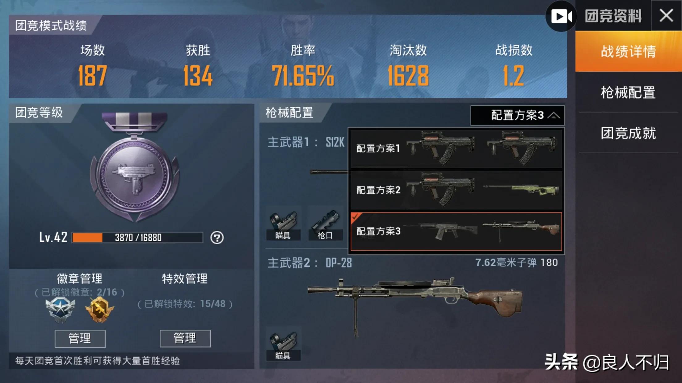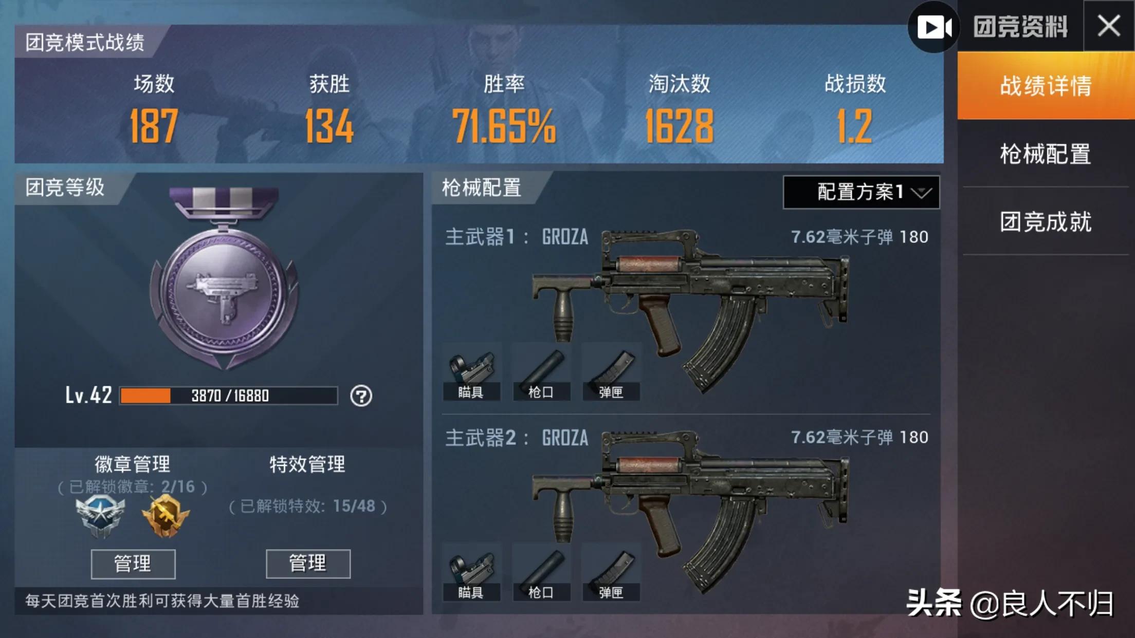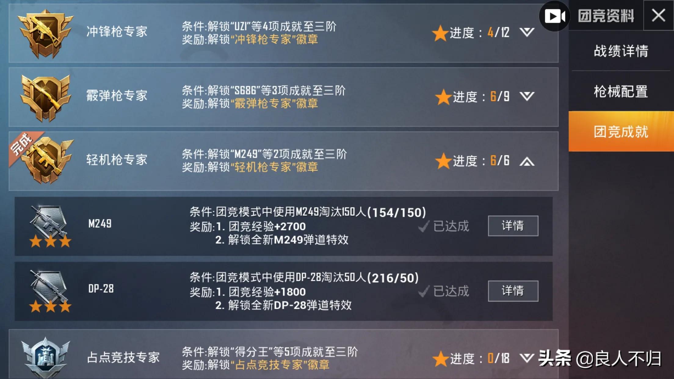 成就除了枪械都刷满了,懒得再刷了。。。最近发现狗杂比762好用,打原距离很稳,所以更推荐狗杂。再加一点,这游戏和状态关系很大,状态不好就别打了(对于我来说是这样,状态好时连续20杀左右,差时杀5个就是人生巅峰各种白给把队友气死。。。水平波动太大了,白天操作很迷,半夜就贼精神~)