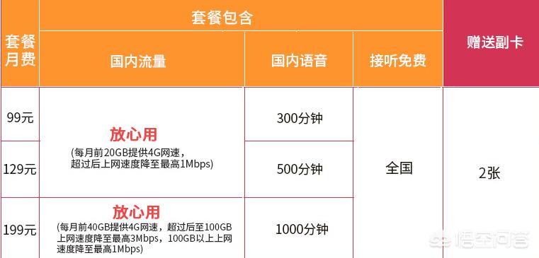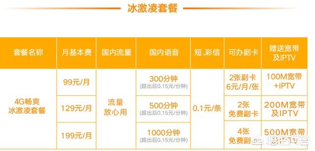 冰激凌套餐分为为3个档次,有99元、129元和199元的。个人觉得129元最划算,包含30G全国流量、500分钟通话时长、200M宽带和2张免费的副卡,副卡可以送给父母使用,这样算一个3口之家一个月只需要129元就可以满足全部的需求了。