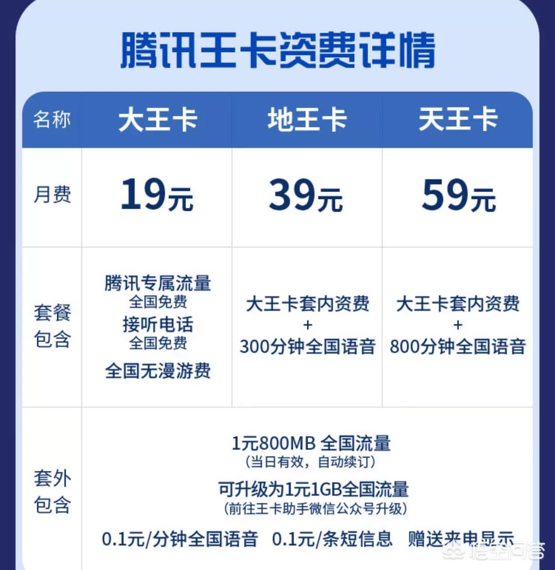 我们看看腾讯王卡套餐:其中地或者天王卡,会有腾讯专属流量,而且对于需要语音通话的用户,39元的地王卡,可以有300分钟的全国语音通话。而且,在套餐外1元800MB,对于需求无限流量的用户相对比较划算。