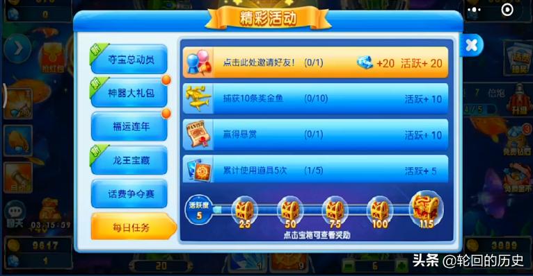 5、获得更多的钻石: 我们还可以通过观看视频,或者做途游捕鱼里的每天的活跃任务去拿钻石,钻石可以用来买道具,提高我们的捕捞技术,用来升级,可以做很多的事情。