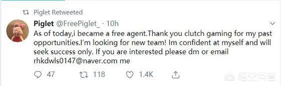16日,Piglet发推,宣布自己成为了自由人,并公布了邮箱地址,寻找新的队伍。