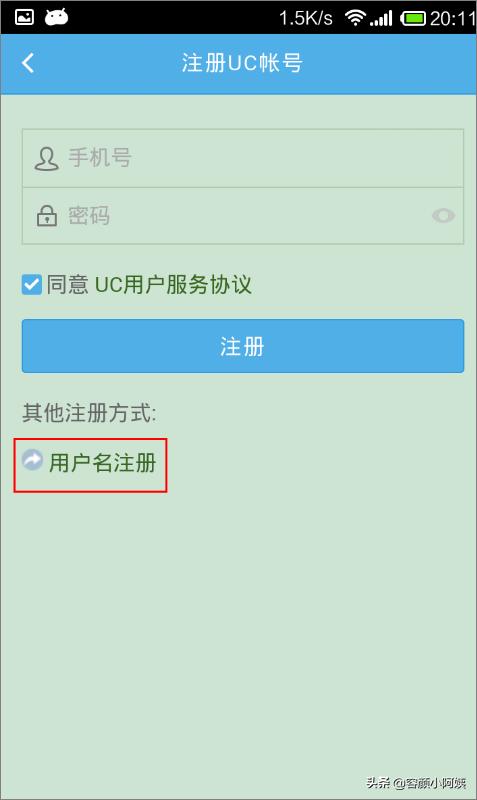 5、在这里,我们以用户名注册为例,点击下面的“用户名注册”。(当然,你也可以用手机号注册,如果需要在多部手机中同步UC浏览器信息的话,推荐使用用户名,更不易混淆)。
