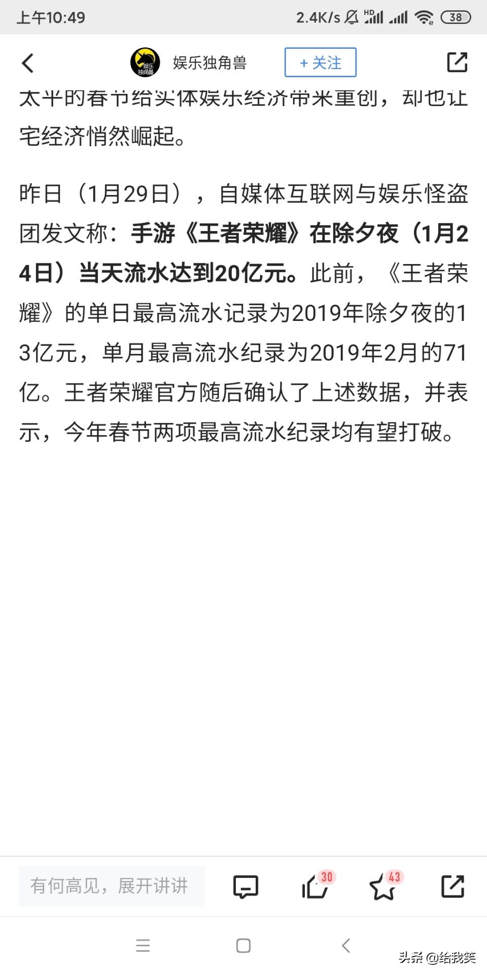 那么为什么这样说呢?我们首先来看王者荣耀的收益,根据官方统计,2019年除夕夜的盈利卫13亿人民币。而2020年除夕夜的收益为20亿人民币,试问除了王者荣耀,又有哪个手游能够日盈利几十亿呢?