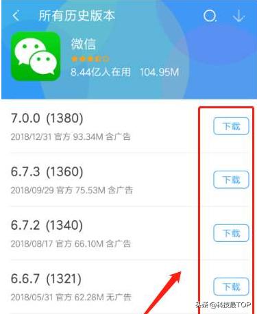 (这不是在打广告)。我们打开这个软件,在这个软件里面找到之前安装过的微信应用,我们进入到软件详情界面,下方有一个【历史版本】。4.点开历史版本然后点击你最喜欢的版本,就可以下载啦!