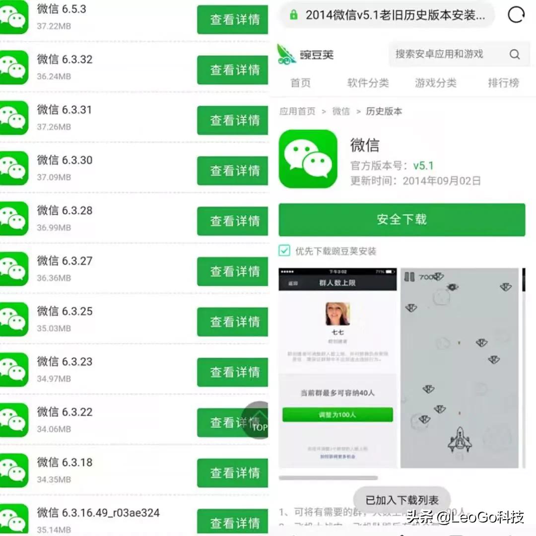 微信历史版本来源选择。通常像PP助手、豌豆荚之类的都有历史版本收录。或者说,如果你有这方面的喜好,也是可以根据微信官方每次发布的版本来进行收藏。只是某些第三方软件做专门收录的可能就更方便些吧。