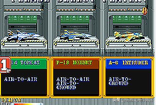 1987和1988年连续出了两代,图上是2代,依然是这个横版卷轴模式,看画面下方的方格子,应该是类似沙罗曼蛇的设定,那个时候这种模式的飞机游戏也是挺流行的,因为竖版的飞机游戏屏幕是纵向的,得有匹配的机台才可以安装基板,所以才开发这么多横版的吧,我瞎猜的。