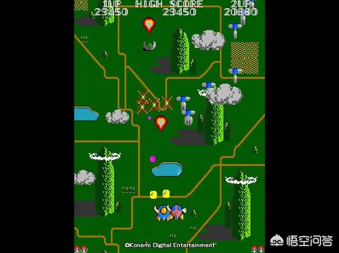也是一款非常经典的射击游戏,同样街机和FC平台都有上线,这个游戏给人的印象还是非常深刻的,飞机还长出了两只手臂,被子弹击中就会掉了,这个飞机游戏没有“雷”的设定,B键是攻击地面上的敌人,云彩中可以打出铃铛,不断地攻击铃铛会变色,不同的颜色象征着不同的效果,熟悉的玩家很容易记住什么颜色代表什么意思,有时候也会只顾着躲子弹而把铃铛错过了,这些都是这个游戏最大的特点,FC版本的卡带还是不那么常见的,街机版的话,很多80后应该都见过吧。
