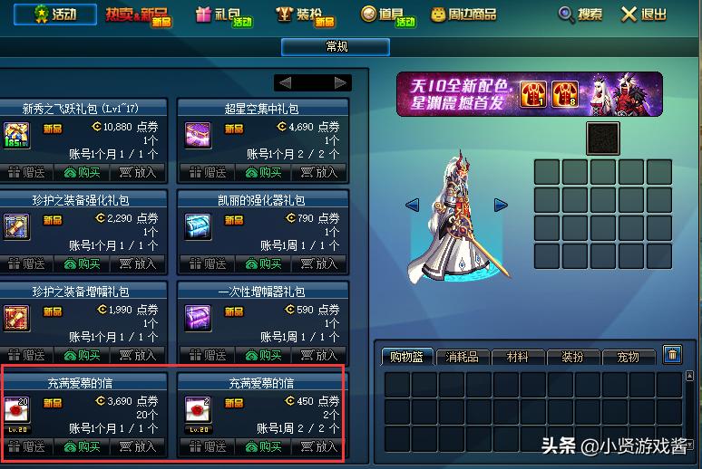 在活动栏这里也加入了盒子的道具,购买20个盒子只用3690点券,购买两个盒子只用450点券,虽然20个盒子月限购一次,2个盒子周限购两次,但是有99%的玩家却不知道,如果用常规模式购买24个盒子需要5960点券,但是在活动一栏中只需要4590点券,可以省下13.7块钱点券。
