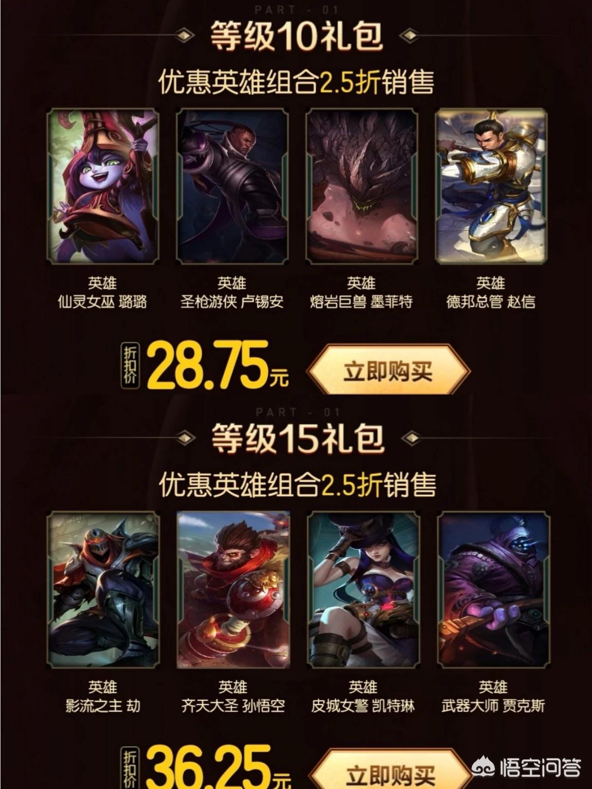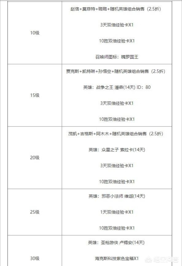 10级以后就是每五级可以领取一次奖励,这里面10、15、20分别可以享受一次英雄组合打包打折销售,这三个等级的奖励打折力度都是2.5折,虽然没有一折那么优惠但也是相当良心,这里面救病包含赵信、贾克斯、孙悟空、阿木木等热门英雄,到了后期打排位也都能够用的上。