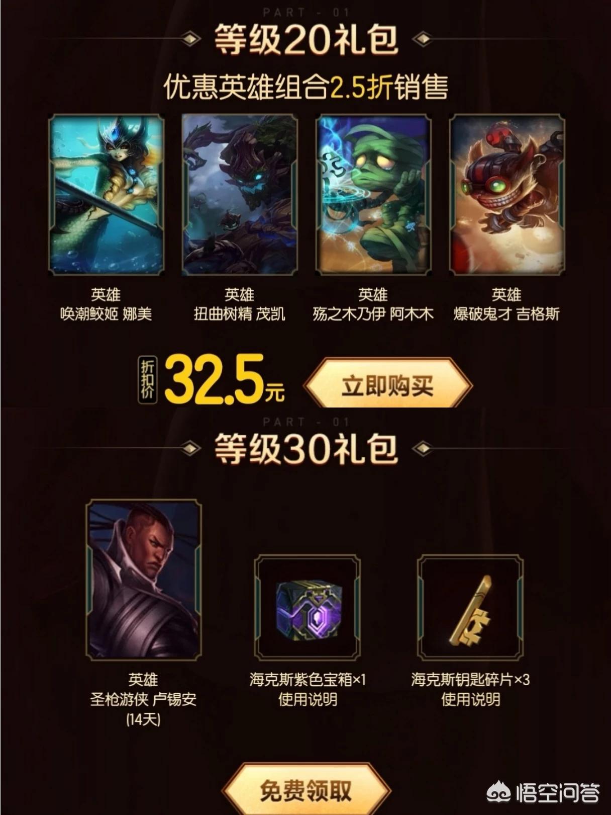 20级的礼包也是4个英雄打包2.5折出售,30级送一个海克斯紫色宝箱,另外10级的时候也会送一个海克斯紫色宝箱。