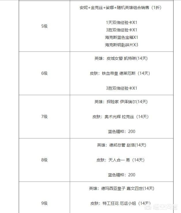 五级的时候可以说是福利最好的奖励,这集的奖励包括安妮+金克斯+婆娑+随机英雄组合打包只要一折销售,可以说是非常的便宜,此外还包括1天的双倍经验卡以及三胜双倍经验卡,外加海克斯蓝色宝箱一个以及海克斯钥匙碎片三个。之后的6-9级每一级都会有一名英雄免费体验,外加一款史诗级皮肤14天的体验。