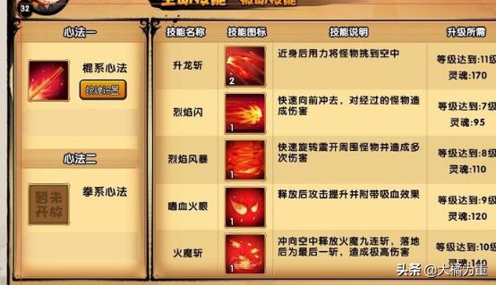 2、和造梦西游3一样,悟空的大部分的招牌技能还都被保留下来了。技能目前只开启了一个心法只能全部学习。但是这套技能有的比较鸡肋,不如烈焰风暴,这个建议不升级,对暴击流的悟空没多大作用。