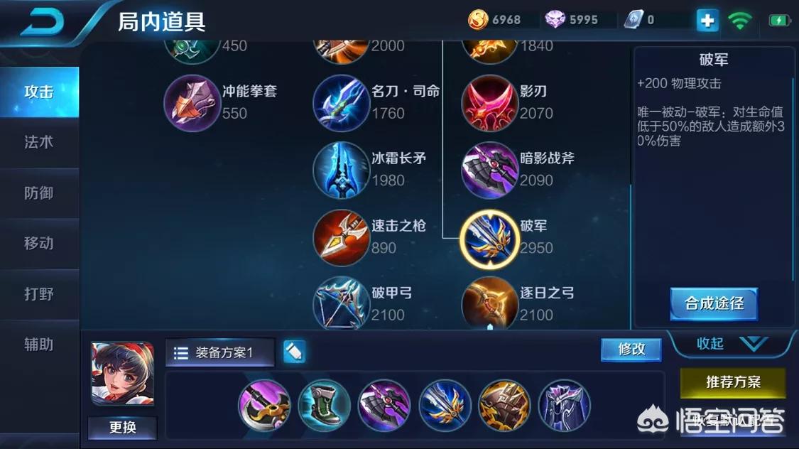 我的出装有两套,逆风一套顺风一套。但是核心装备是暗影战斧和破军,是先出的。后面的两件就有所变化。如图中所示