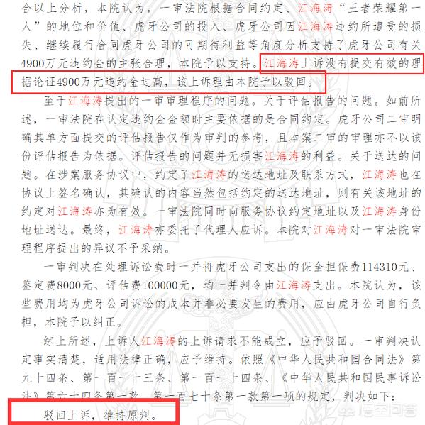 想必很多网友都知道,关于王者荣耀主播嗨氏违约跳槽二审判决书最终结果。来自中国裁判文书网的民事案件判决书,近日嗨氏(江海涛)对和虎牙直播合同纠纷案一审判决不服再次上诉,但是二审的最终的宣判结果是:嗨氏没有提供有效理据论证4900万的违约金过高,驳回嗨氏上诉,维持一审判决。