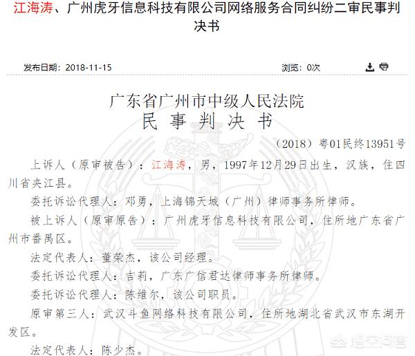 首先我们可以从虎牙的态度可以看出,包括现在虎牙玩儿的比较好的 比如哈迪斯(玩儿李白比较好的)还有心态,(之前是DAE心态,后来不知怎么的改成了虎牙心态)可能是改了公会但是没有换平台,因为他们知道,既然签订了合同,那么最起码就要遵守,这就像玩儿游戏一样,既然想玩儿就要遵守规矩。大家说是吧?嗨氏,江海涛 97年出生 现在也就21岁了,年龄还很年轻。而且游戏技能也不错,但是错就错在了,法律意识淡薄,对方斗鱼没有说清出违约金的问题是否会给他赔付,如果你违约金少可能会给你赔偿,但是作为虎牙数一数二的主播,你签约的金额肯定是大几千万,最起码5000万以上。难道跳平台违约 这点儿都不知道吗?