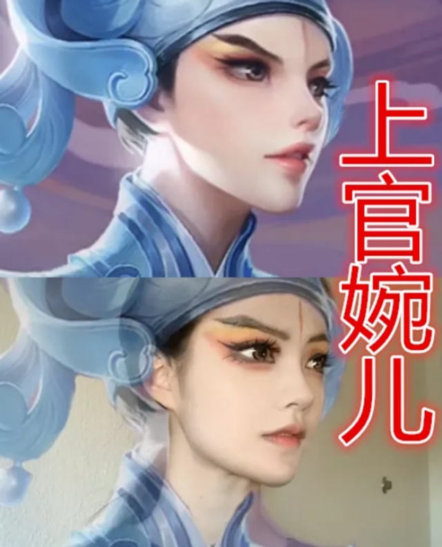 而最近又有一部分cos玩家。他们不光cos英雄们的服装主要是用妆容来cos英雄们的形象。当我看到这些图片时,我也有点怀疑他们的真实程度,但是看评论再回头仔细看这些照片应该都是真的。又让我不得不感叹现在的化妆技术真的是让人叹为观止。这已经不能用一个像字来形容了,简直是一模一样。下面给大家看几张图片,大家自己来评判一下,首先是上官婉儿的,无论是姿势或者是妆容,甚至就连嘴巴的嘴型都按照英雄来的,这张图片看起来给人一种非常秀气的感觉。