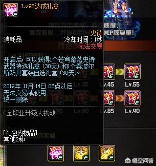 满级95的时候,获得95满级达成礼盒,内含30天期限苍穹幕落武器,强化11锻造6,还有一套30天期限的泰波尔斯防具自选。