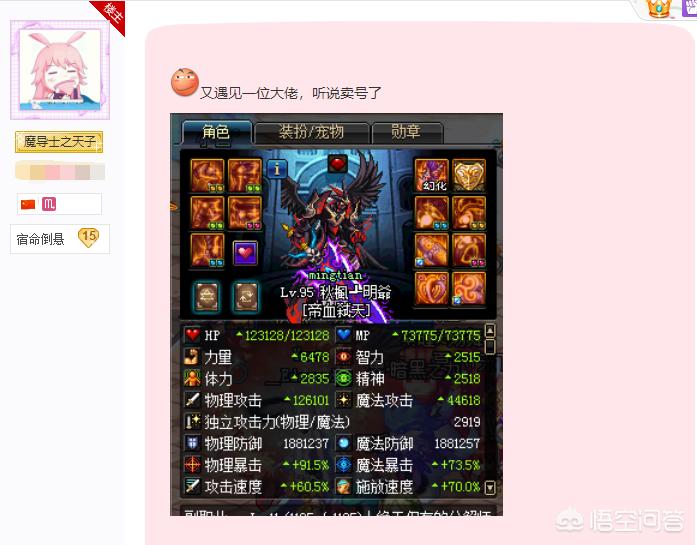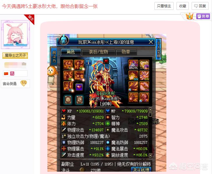 跨五比较知名的大神有lee暗地现在已经不玩了,同时还有一位号称国服第一剑帝挚爱我柯,但是在平常的玩家里也有许多大神存在,比如这位玩家今天就偶遇到了一位逆天的剑魂冰彤大佬,力量高达6.8W,物攻更是达到13.4W,比能普雷门槛5W剑魂还要高8W物攻,至少也是全身增幅13~14的水平。