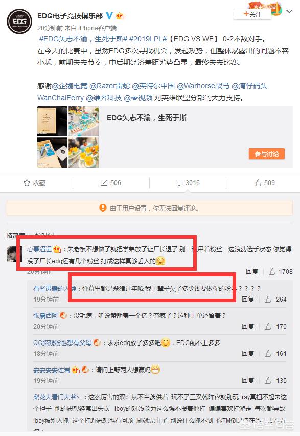 没用20分钟,EDG的官博就有3000多个回复,别误会,大家不是来安慰EDG的,而是集体来发泄心中怒火的,有玩家表示EDG本来就没什么新粉丝,在让老粉丝伤了心,恐怕EDG今后的比赛就没人看了。