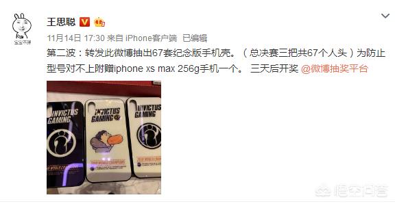 传说中的买手机壳送手机是根本不存在的,不过在王思聪这里就不一样了,你不需要花钱购买,中奖就送IG定制的手机壳,而且防止你型号对不上,随“壳”赠送你iphone X nax 256G手机哦。奖品一共67份,纪念IG战队在三局比赛中一共获得了67个人头。