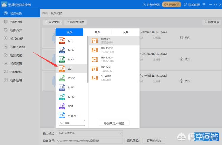 2、添加好视频后设置视频输出到电脑的“输出格式”,输出格式又分为视频格式和视频分辨率。因为要把qsv格式转换成avi格式,所以注意把输出的视频格式设置为‘avi’格式。